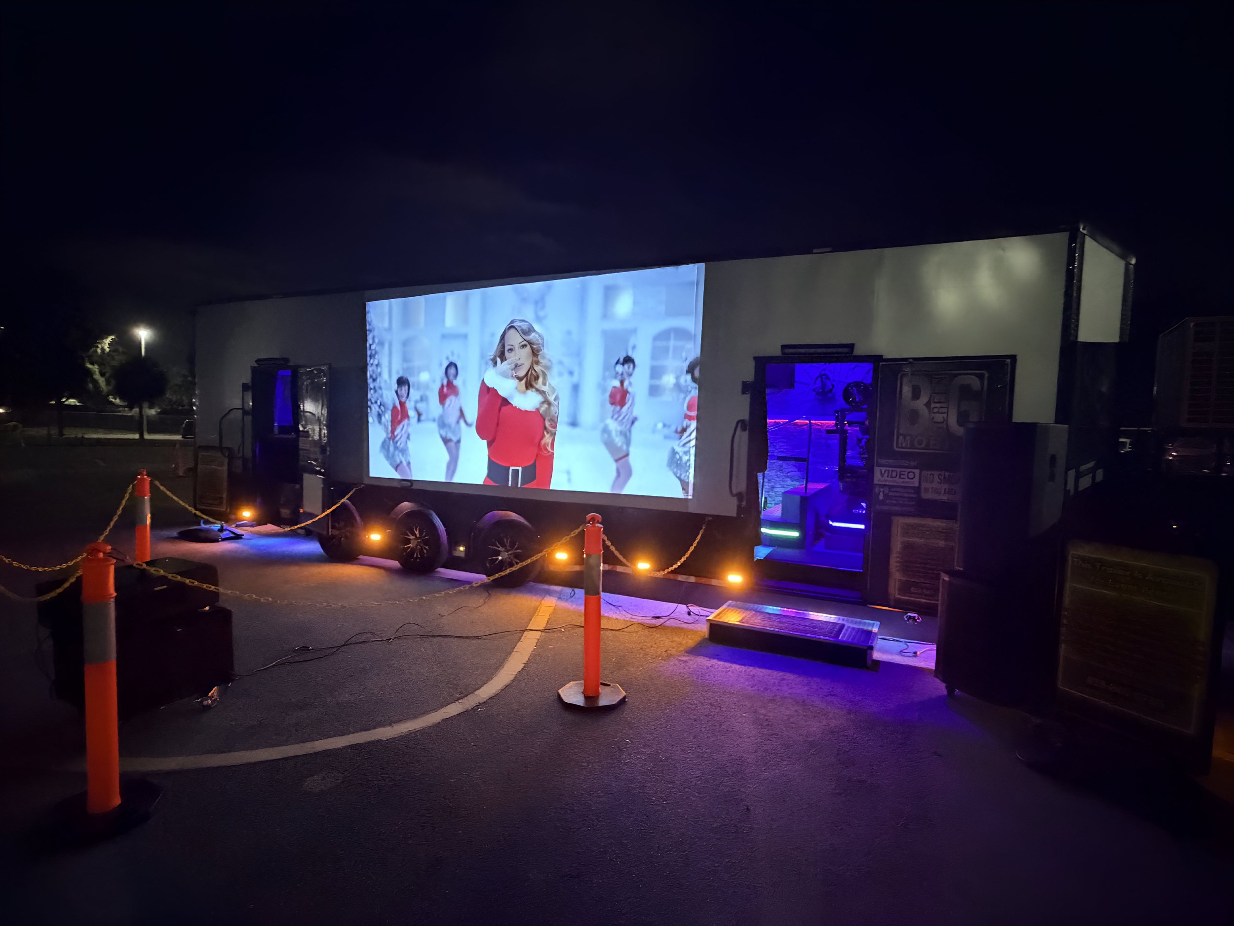 Outdoor mobile movie theater screen showing a woman in Christmas attire with dancers in the background, set up in a parking lot at night, surrounded by orange traffic cones and chains.